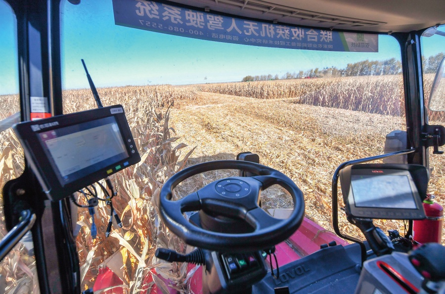 在中国科学院“黑土粮仓”科技会战长春示范区公主岭示范基地,无人驾驶农机在收获玉米 (2023 年 10 月 19 日摄) 张楠摄 / 本刊