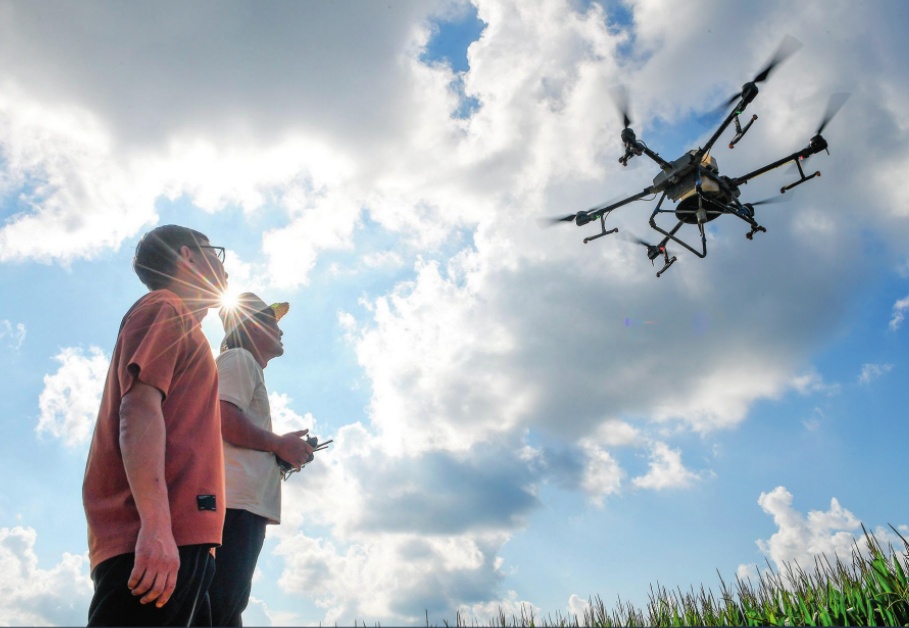 在吉林省梨树县孤家子镇,孤家子镇农业发展服务站高级 农艺师兰雨壮(左)和无人机操作手一起查看植保无人机作业 情况(2024 年 8 月 8 日摄) 张楠摄 / 本刊