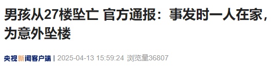 经初步了解,男孩未满8周岁,家住27楼,事发当时小孩一人在家中,为意外坠楼。后经抢救无效宣布死亡,目前孩子的后事家长已在处理中。