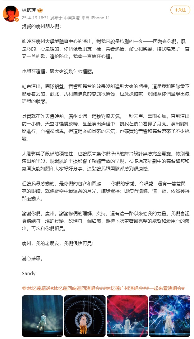 4月13日晚,歌手林忆莲在社交平台发文,称昨晚在广州大学城体育中心的演出,是特別的一夜。“音乐和舞台的效果沒能达到大家的期待,这是我和团队最不愿意看到的,对此,我和团队真的感到很遗憾,也深深抱歉,沒能为你们呈现出最理想的状态。”