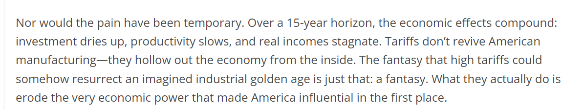 文章说,经济模型表明,如果特朗普政府的关税计划全面生效,美国的实际消费将在 2025 年下降 2.4%,GDP 将收缩 2.6%,就业将下降 2.7%,这将意味着数百万个工作岗位突然消失。而且,这种痛苦也不是暂时的,负面影响将在未来15年陆续释放。比如投资枯竭、生产力放缓、实际收入停滞不前。通过关税振兴美国制造业只是一种幻想,其真实结果是从内部掏空美国经济。