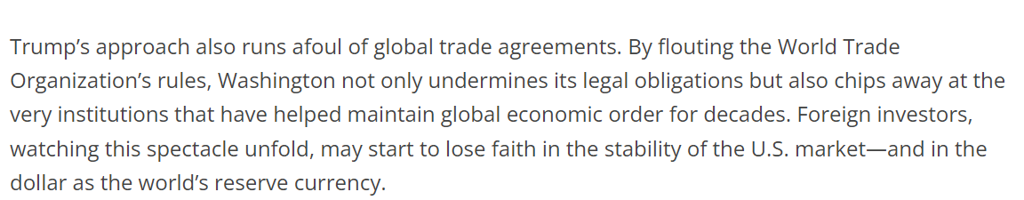 特朗普的做法还违反了全球贸易协定。文章说,这种做法已突破国际贸易协定的底线。美国不仅通过挑战世贸组织规则体系动摇了其国际法治根基,更逐步侵蚀着支撑全球经济秩序数十年的制度框架。而且,这种政策转向正在引发连锁反应:国际资本对美国市场稳定性的疑虑不断加深,甚至可能动摇美元作为全球储备货币的信用基础。