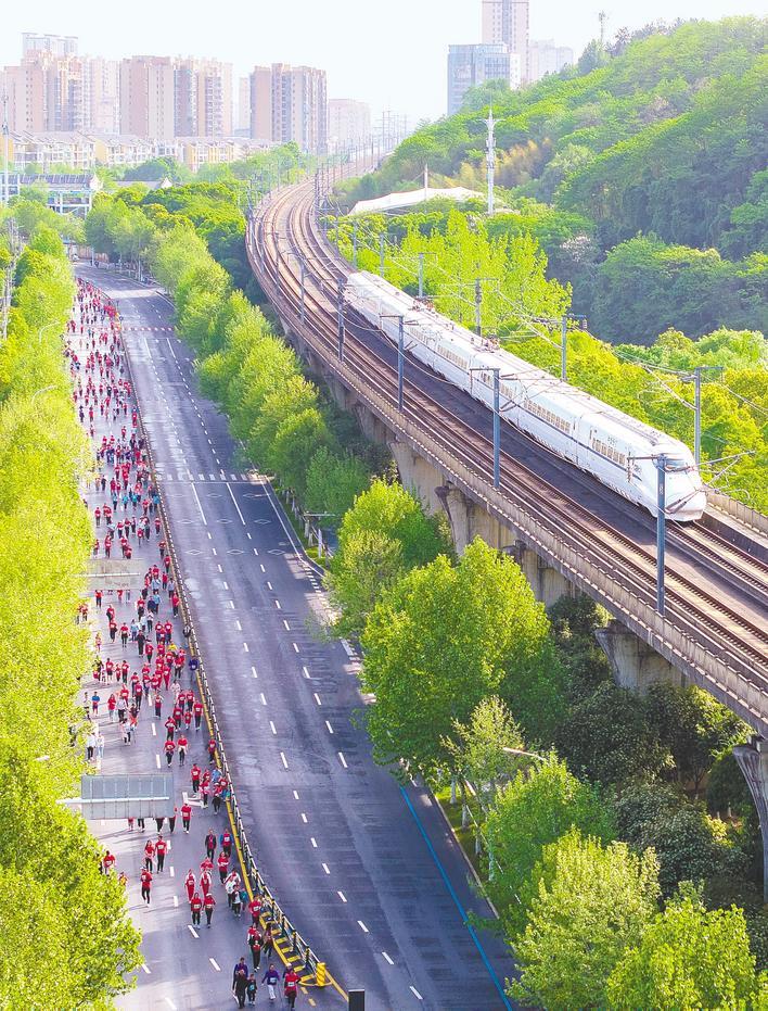 咸宁马拉松参赛者与城铁列车同框。(湖北日报全媒记者 魏铼 摄)