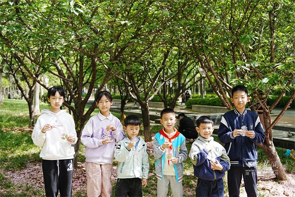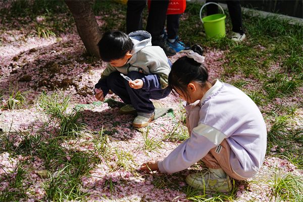 樱花书签制作环节,孩子们仔细收集飘落的樱花花瓣,并发挥奇思妙想,将收集的花瓣剪裁拼贴,制作成一个个精美的樱花书签。这些独一无二的书签不仅留住了春天的美好,更在孩子们心中播下了环保的种子。