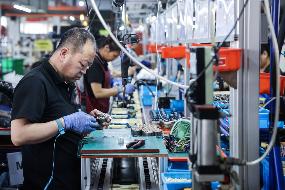 4月1日,在浙江白云浙变电气设备有限公司,工作人员在厂房装配22万伏特高压油浸式变压器。该公司输变电设备出口全球,一季度产值达2.2亿元。新华社记者 翁忻旸 摄