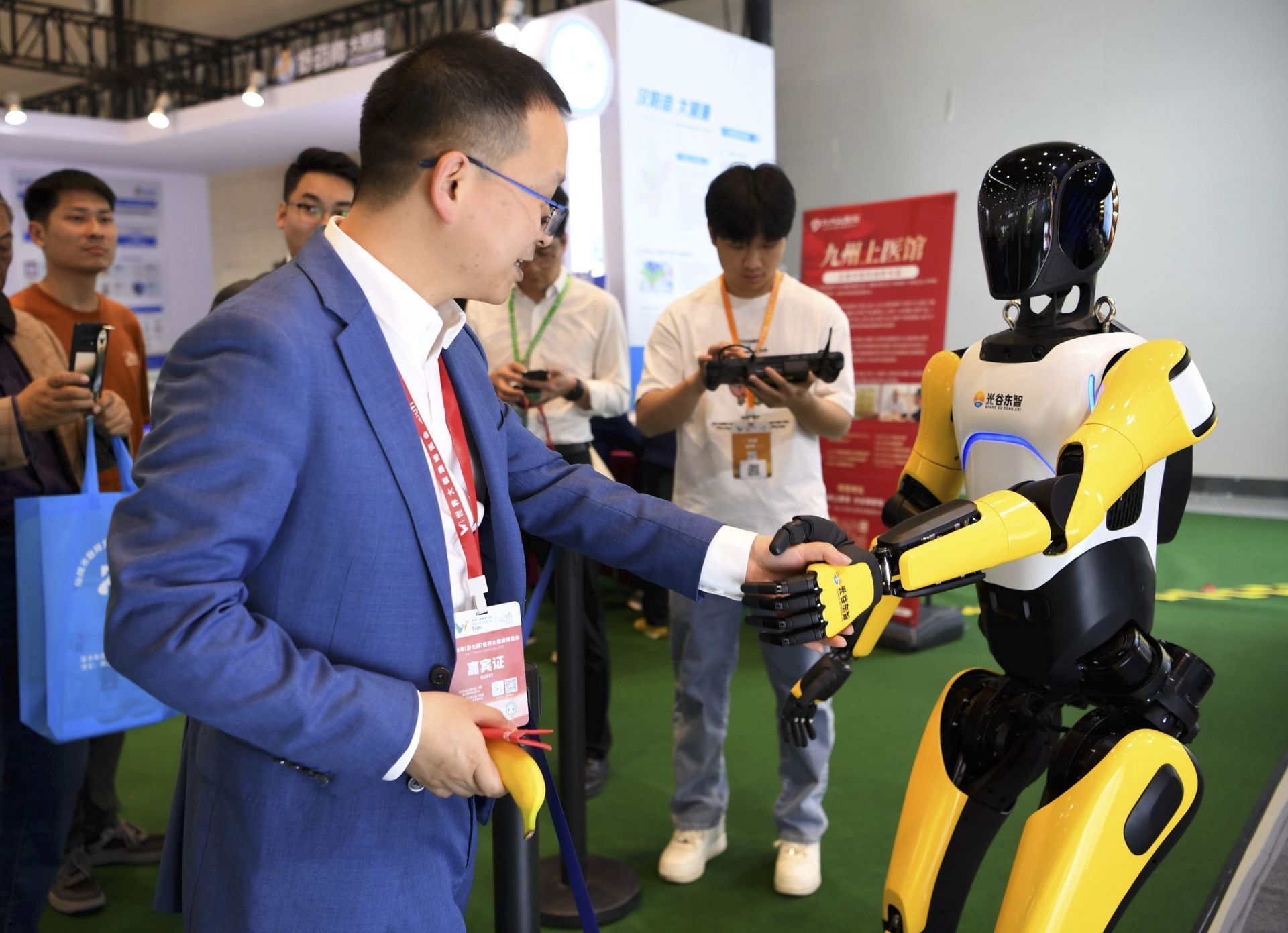 光谷东智科技展示的A2智能机器人吸引了大家的目光,不少观众与它握手互动。4月8日,2025年第七届世界大健康博览会上,智能机器人纷纷登台。