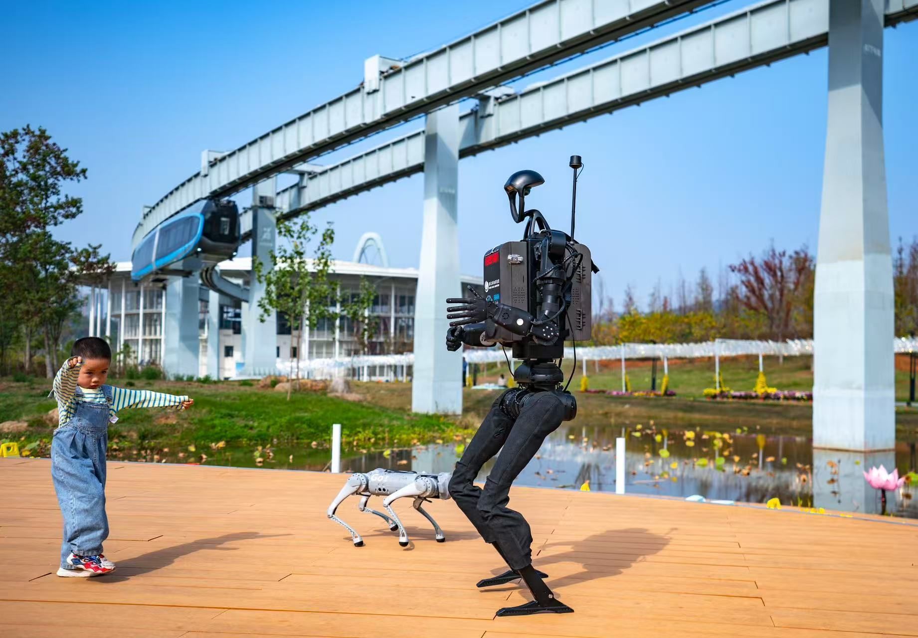 在武汉东湖高新区空轨高新大道站,一辆空轨列车正在驶过;生态大走廊上,装载了光谷造“大脑”的人形机器人和四足机器狗,正与看AI展的小朋友斗舞。