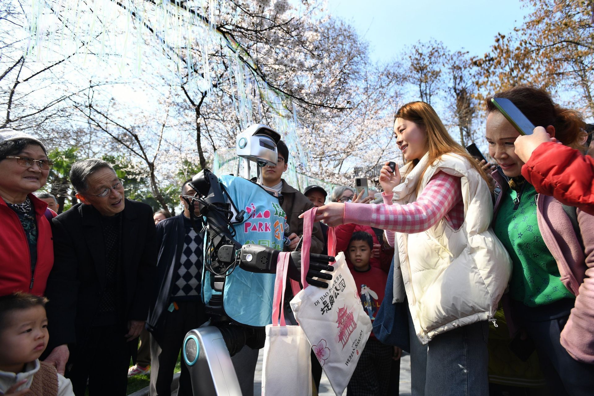 3月19日,堤角公园,人形机器人“小天”穿过樱花云廊,精准避开奔跑的孩童。