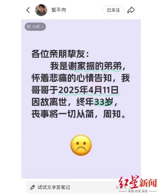 记者注意到,该账号发布的最后一条信息停留在4月11日,该账号称:“各位亲朋挚友,我是谢某振的弟弟,怀着悲痛的心情告知,我哥哥于4月11日因故离世,终年33岁,丧事将一切从简。”