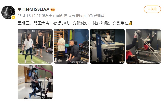 4月16日,知名歌手萧亚轩在社交媒体晒出自己的健身照片,并配文:“星期三,开工大吉,心想事成,身体健康,健步如飞,喜乐常在。”