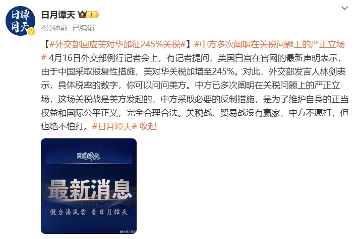 4月16日外交部例行记者会上,有记者提问,美国白宫在官网的最新声明表示,由于中国采取报复性措施,美对华关税加增至245%。