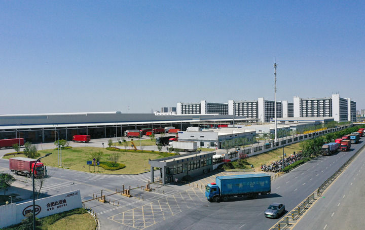 春风和煦,杨柳轻舞,从合肥市区驱车向北约35公里,行至长丰县中南部的下塘镇,以比亚迪命名的主干道上,运送汽车零部件的货车排成长长一列,鱼贯而入比亚迪合肥基地园区。