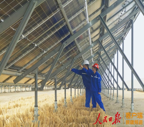 中电建阿克苏地区沙雅县25万千瓦光伏产业园区,工人们正在检查光伏板状态。马雯萱摄