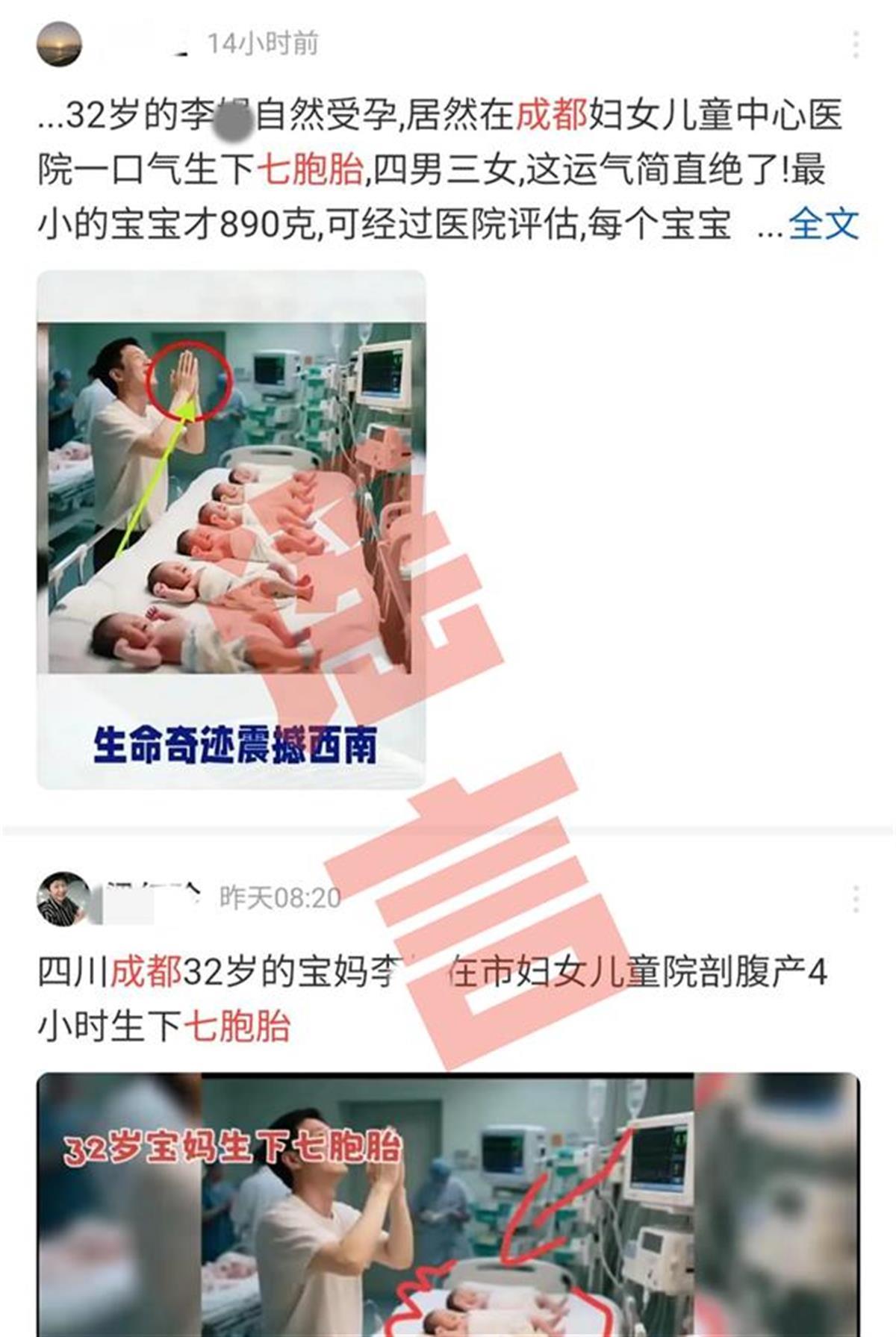 连日来,多个自媒体账号发文称,四川成都一名孕妇在市妇女儿童医院成功诞下7胞胎。4月19日,记者咨询四川省、成都市卫健部门以及成都多家知名妇产医院,工作人员均表示没听说过此事。成都市妇女儿童中心医院官方表示此为谣言。