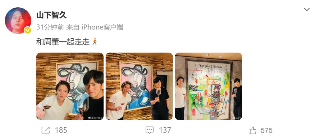 4月19日,日本男星山下智久在微博晒出与周杰伦的合影,配文:“和周董一起走走。”网友纷纷猜测二人是否会有合作计划。
