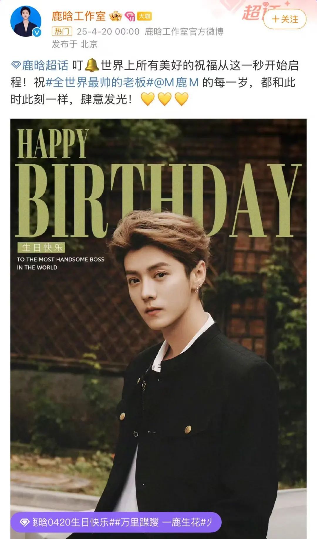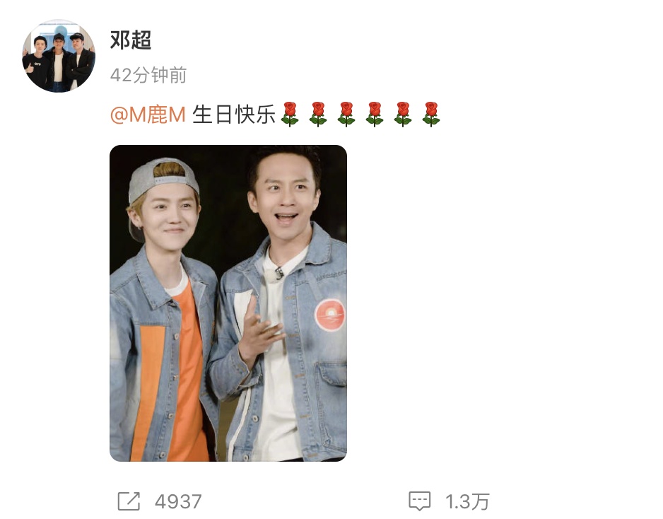 与此同时,演员邓超、陈赫率先发文为鹿晗庆生。4月20日0点,邓超晒出合照并送上生日祝福。陈赫也发布与鹿晗的合影,配文“鹿,生日快乐”。目前,鹿晗的微博头像仍为与邓超、陈赫的合照。