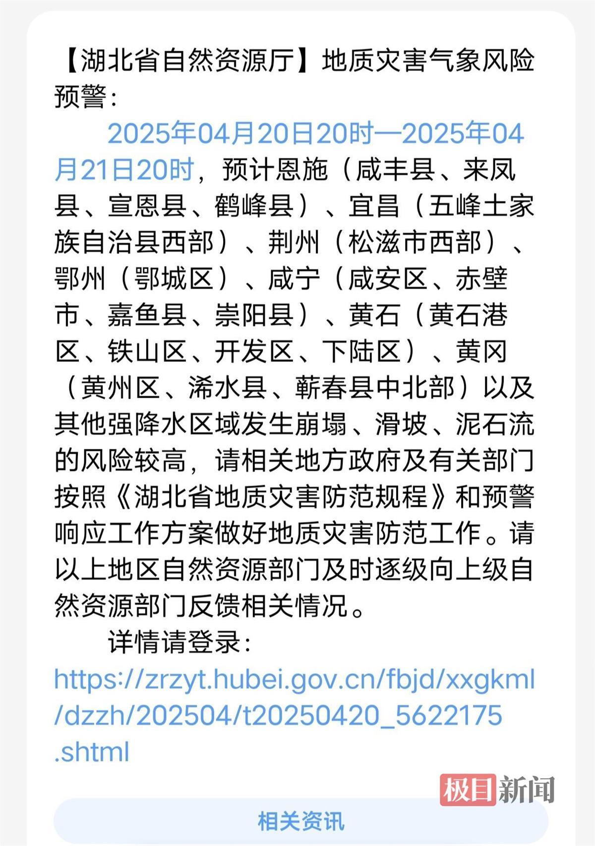 4月20日16时许,湖北省自然资源厅和湖北省气象局联合发布预警:4月20日20时—4月21日20时,预计恩施(咸丰县、来凤县、宣恩县、鹤峰县)、宜昌(五峰土家族自治县西部)、荆州(松滋市西部)、鄂州(鄂城区)、咸宁(咸安区、赤壁市、嘉鱼县、崇阳县)、黄石(黄石港区、铁山区、开发区、下陆区)、黄冈(黄州区、浠水县、蕲春县中北部)以及其他强降水区域发生崩塌、滑坡、泥石流的风险较高,需注意防范!