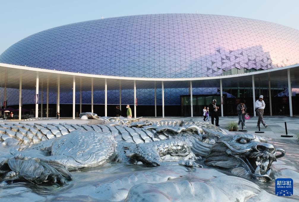 在主场馆外的中央广场,一个圆形的不锈钢浮雕吸引不少人驻足欣赏。走近看,浮雕上的九条龙形态各异、须发张扬,神兽威严庄肃之感呼之欲出。夜幕降临,浮雕中央象征“龙眼”的圆形电子屏幕不断变换色彩,与主场馆交相辉映。