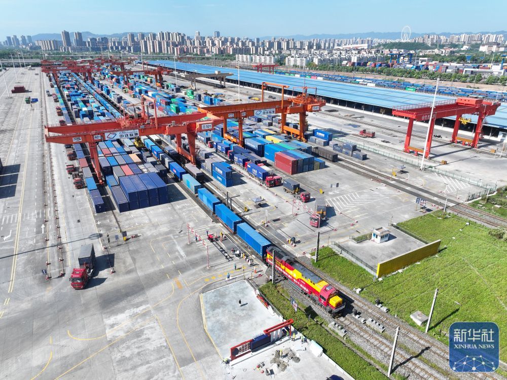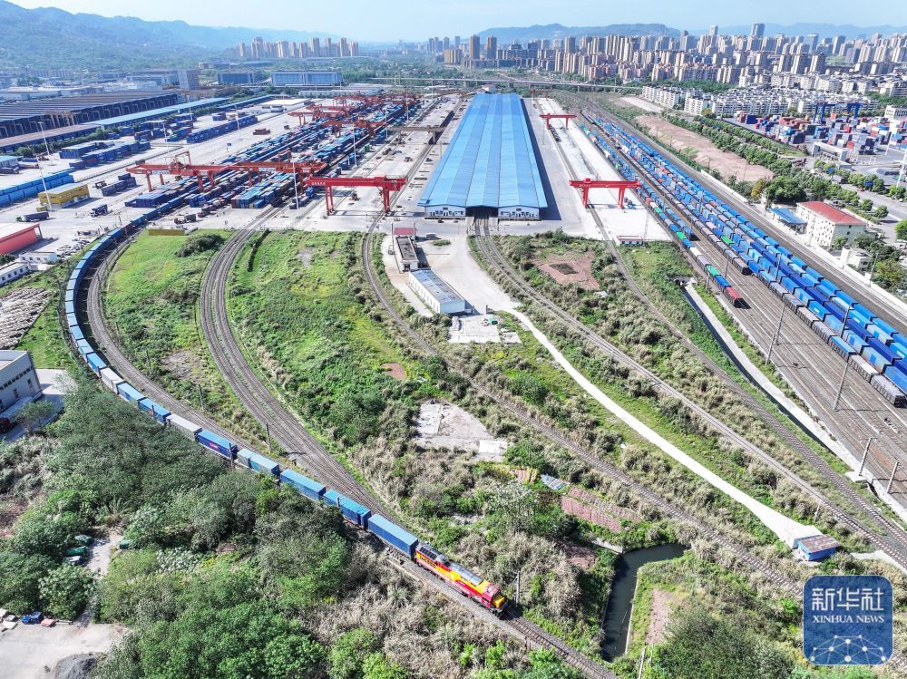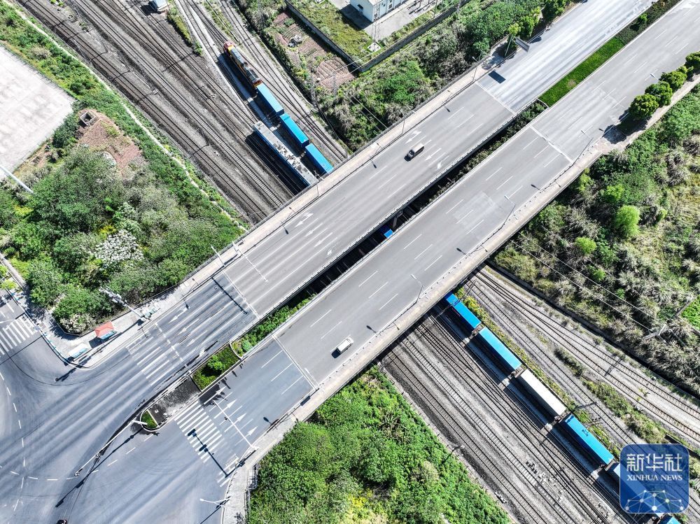 ↑ 4月20日,图定中亚班列在重庆团结村中心站顺利发车(无人机照片)。