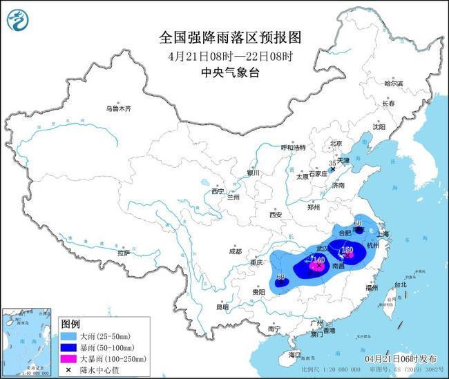 预计,4月21日08时至22日08时,贵州东部、重庆东南部、湖北东部和南部、湖南中北部、江西北部、安徽中南部、江苏西南部、浙江西部、福建西北部以及河北东南部等地部分地区有大到暴雨,其中,湖南东北部、江西北部等地局地有大暴雨(100~150毫米)。上述部分地区伴有短时强降水(最大小时降雨量30~50毫米,局地可超过70毫米),局地有雷暴大风或冰雹等强对流天气。