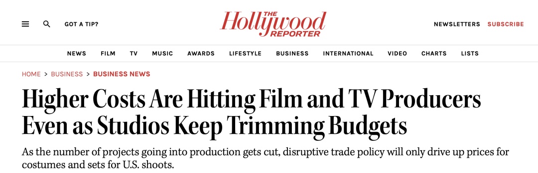 这是《好莱坞报道者》发表的一篇题为《在电影行业缩减预算之际,美国电影制造商还要面临高额关税夹击》的报道。