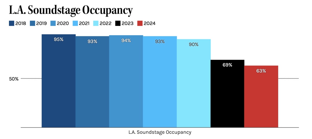 反映在数据上,FilmLA的报告显示,2024年洛杉矶摄影棚使用率从90%以上骤降至63%,项目数量和拍摄天数均跌至近六年新低。