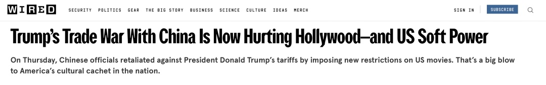 这是美国媒体《WIRED》发表的一篇报道,主题是特朗普对华发起贸易战正伤害好莱坞与美国软实力。