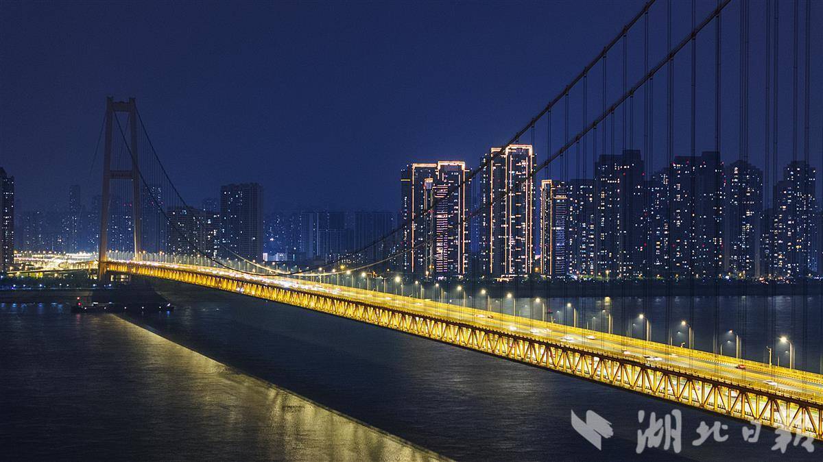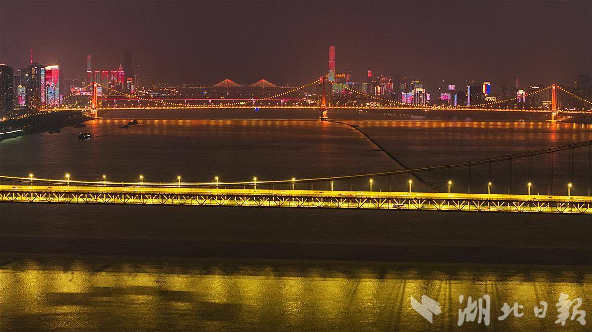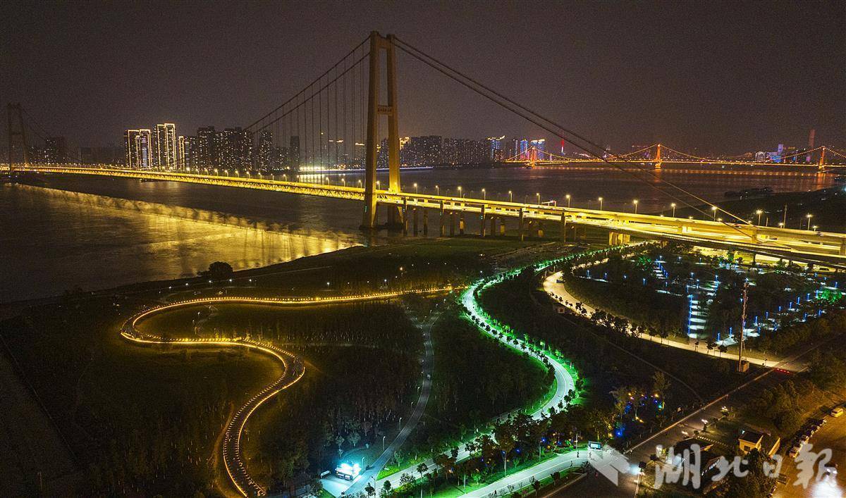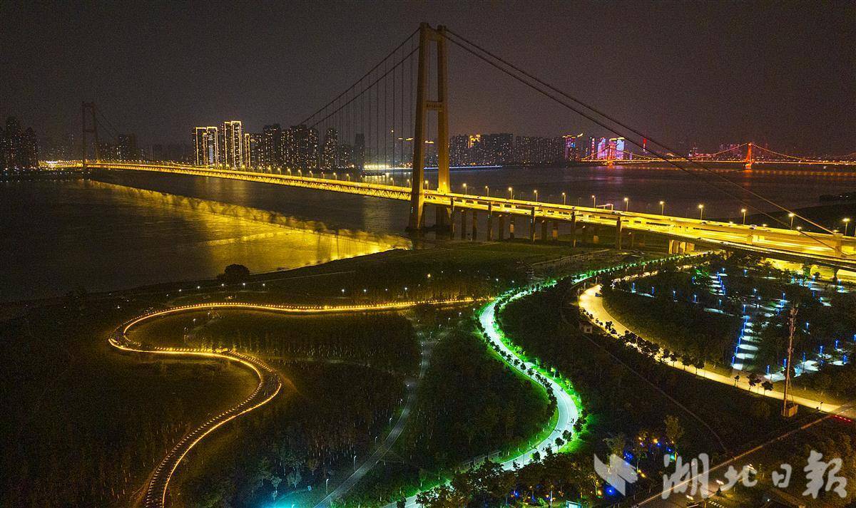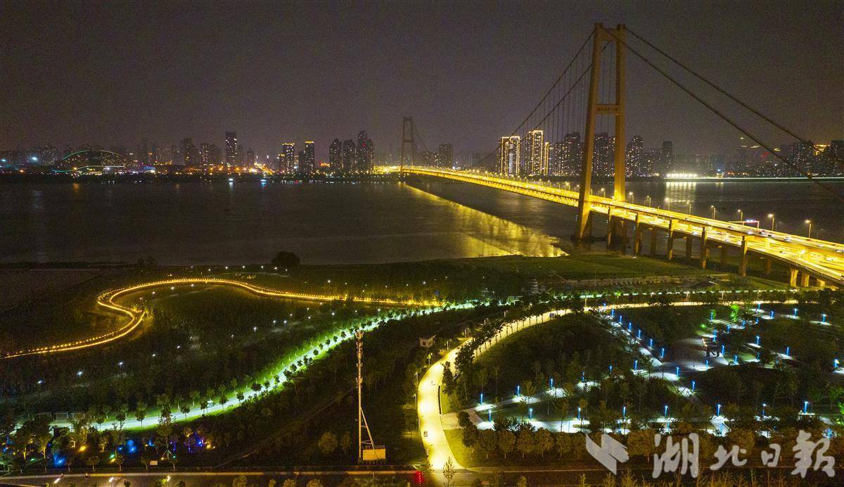4月20日晚,鸟瞰武汉洪山江滩,静卧在公园绿地上的步行栈道蜿蜒如一条火龙,与从林中弯弯曲曲的绿色小道相映成趣。每当夜幕降临,市民和游客络绎不绝涌入洪山江滩的杨泗港长江大桥南岸桥头公园,赏夜景,吹江风。(湖北日报全媒记者 朱熙勇 摄)