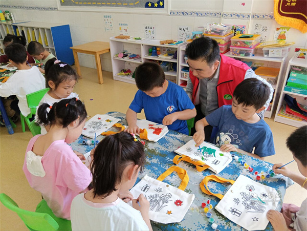 为进一步加深孩子们对色彩与情绪关联的认知,现场还设置了创意填色DIY环节。孩子们拿到材料后立刻投入创作,展现出了丰富的创造力。他们用心挑选颜料,仔细地为帆布包上色,每一笔都倾注了他们对色彩的理解和对生活的热爱。有的孩子选择了浓烈的红与黄,表现冒险和探索的激情;有的孩子则偏爱柔和的蓝与绿,传递内心的宁静与温暖。每一个帆布包都承载着孩子们的独特创意,成为他们情绪表达的生动载体。