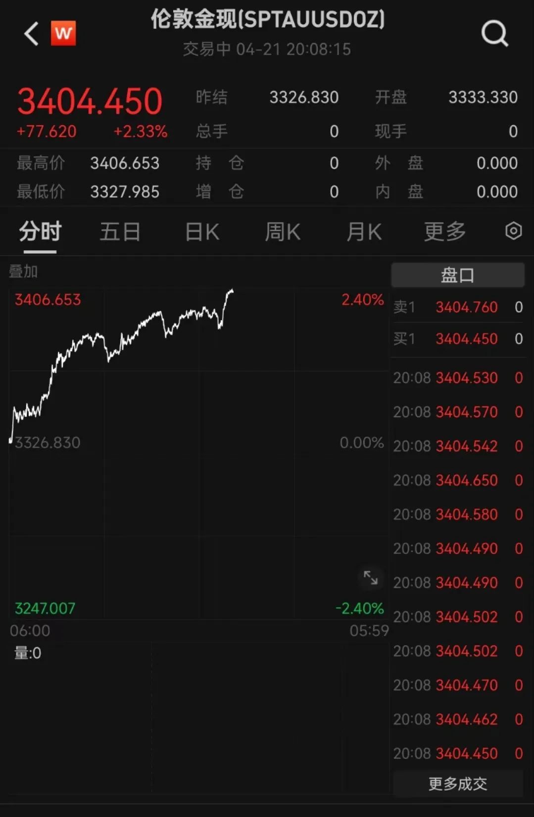 4月21日19时40分左右,现货黄金成功站上3400美元/盎司为历史上首次,截至发稿,最高触及3406.653美元,日内拉升超70美元,今年迄今累涨逾29%。