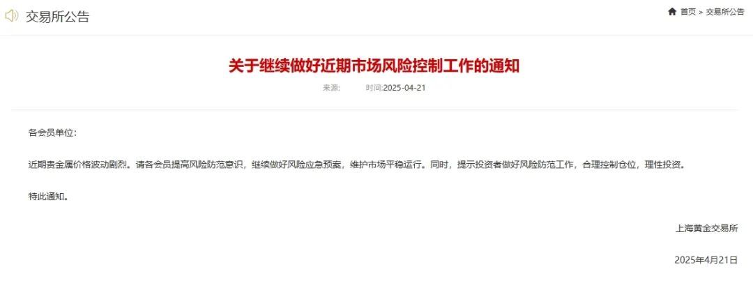 4月21日上午,上海黄金交易所也向会员单位发布风险提示称,近期贵金属价格波动剧烈,请各会员提高风险防范意识,继续做好风险应急预案,维护市场平稳运行。同时,提示投资者做好风险防范工作,合理控制仓位,理性投资。