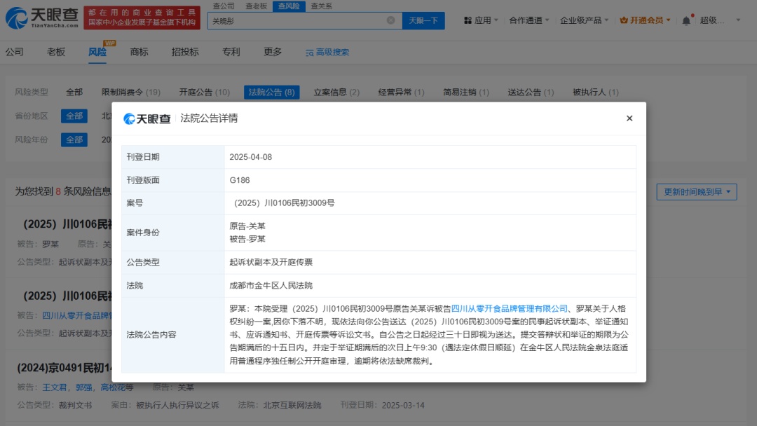据天眼查App显示,近日,成都市金牛区人民法院分别向四川从零开食品牌管理有限公司、罗某东、罗某琴公告送达关晓彤与其人格权纠纷一案起诉状副本、开庭传票等诉讼文书,自公告之日起经过三十日即视为送达,并定于举证期满后的次日上午开庭审理。