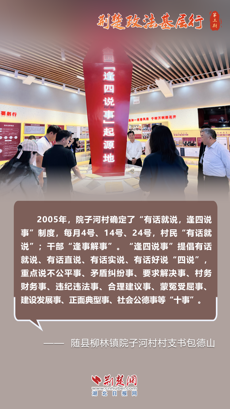 “每月4号、14号、24号,村民‘有话就说’;干部‘逢事解事’。”在随州市随县院子河村,《民情记录簿》记载了20年来200多起矛盾纠纷的调解台账。该村首创“逢四说事”制度已在十多个省市推广,成为全国“逢四说事”的起源地。