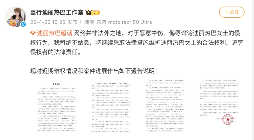 4月23日上午,@嘉行迪丽热巴工作室 发布通告说明:网络并非法外之地,对于恶意中伤、侮辱诽谤迪丽热巴女士的侵权行为,我司绝不姑息,将继续采取法律措施维护迪丽热巴女士的合法权利,追究侵权者的法律责任。