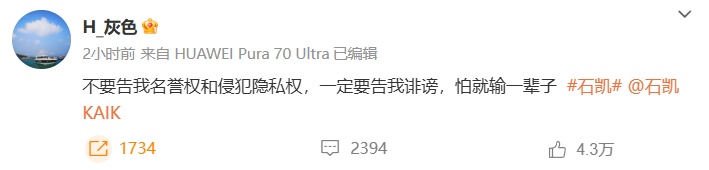 23日,石凯转发委托律师声明,称“出轨”、“PUA女性”、“非和平分手”为不实信息,并要求相关发布用户立即删除侵权内容。