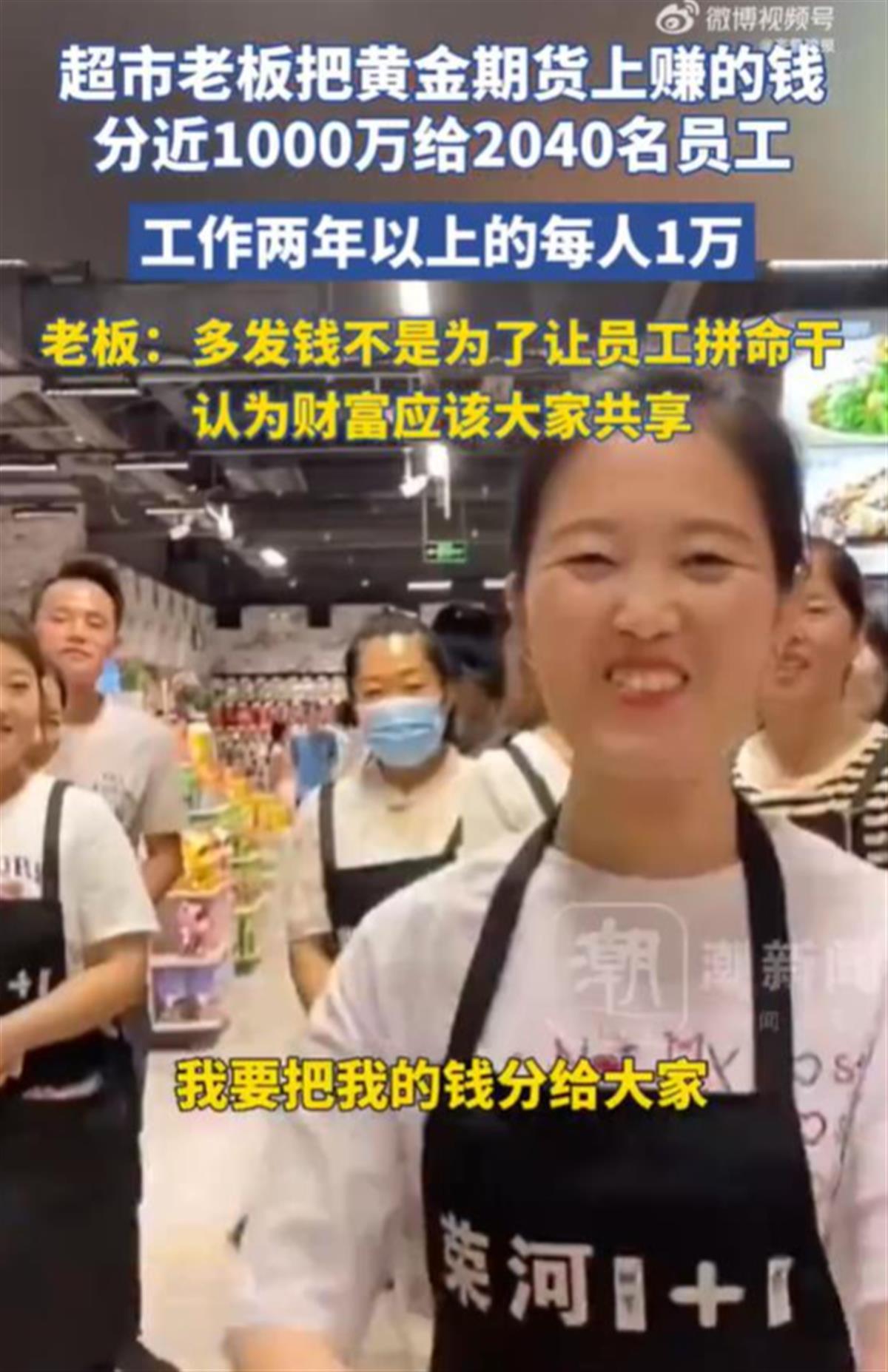 4月24日,有多名网友发视频称,山西荣河1+1生鲜超市的老板因投资黄金期货赚了钱,拿出近1000万元分给了员工,连保洁和做饭的也有。