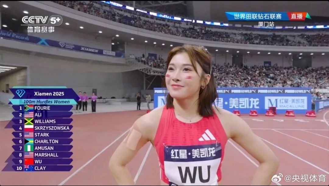 4月26日晚,2025钻石联赛厦门站女子100米栏决赛,吴艳妮以13秒00刷新个人赛季最佳成绩,获得第七名。牙买加选手威廉姆斯12秒53获得冠军。