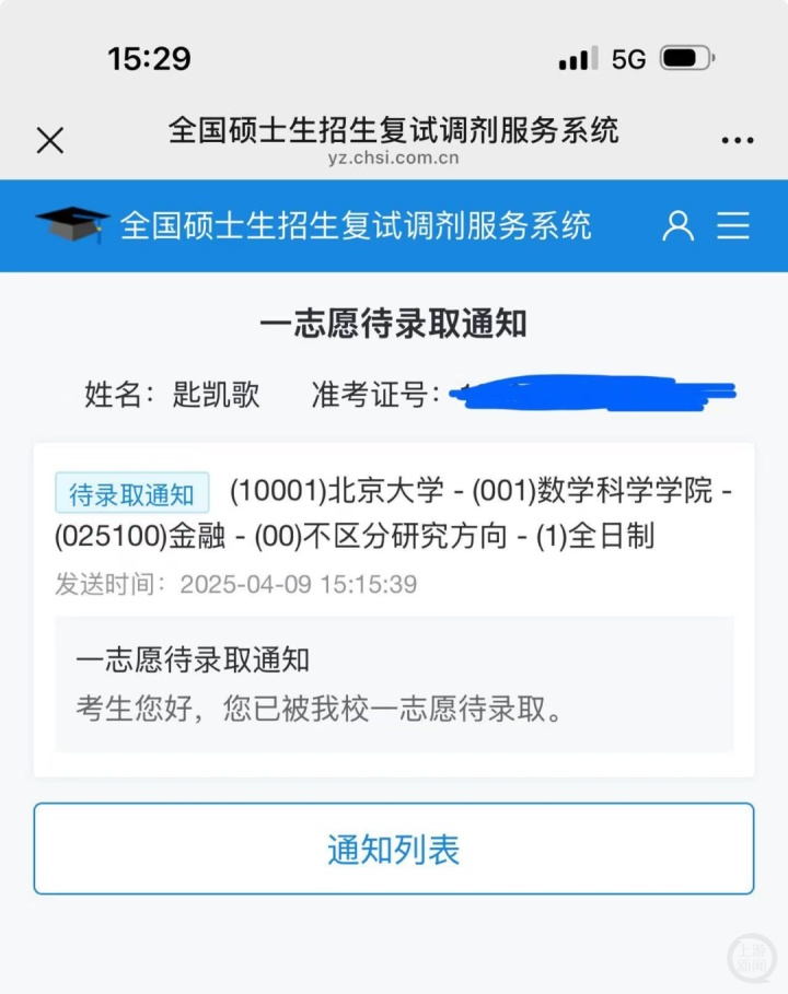 北大数院官网显示,数学科学学院下设四个系,即数学系、概率统计系、信息与计算科学系和金融数学系。发布于今年4月3日的《数学科学学院2025年硕士招生拟录取公示名单》显示,该名单序号第14为匙凯歌,拟录取专业为金融,初试成绩412分,复试成绩74.6分,总成绩为80.06,学习方式是全日制,非定向就业。其公示时间为4月3日至9日。