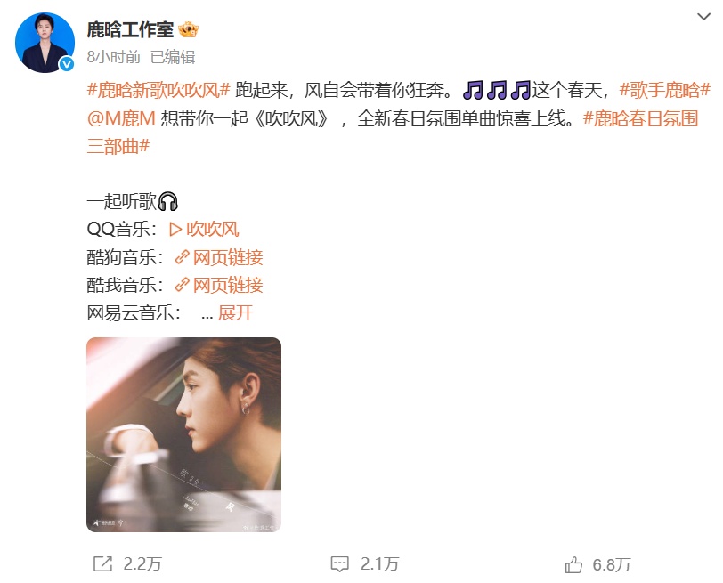 4月27日零点,@鹿晗工作室 带来鹿晗新歌《吹吹风》,全新春日氛围单曲惊喜上线。