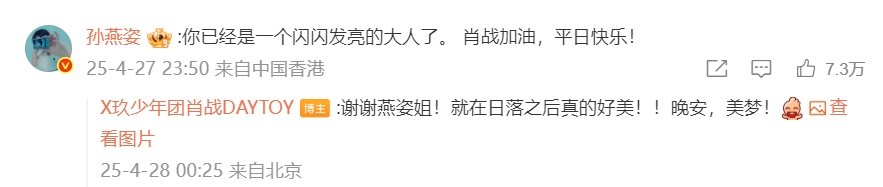 随后肖战再次回应:“谢谢燕姿姐!就在日落之后真的好美!!晚安,美梦!”