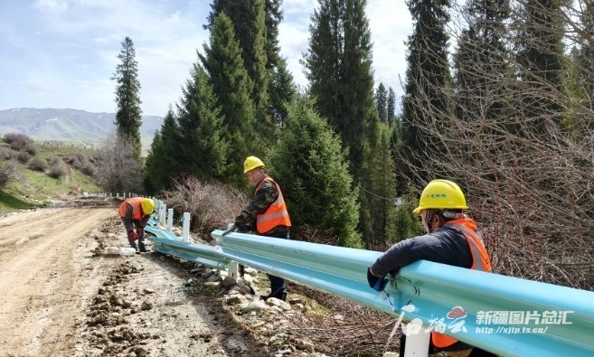 4月以来,S345线库尔德宁—恰西—塔里木—喀拉峻公路工程项目全面启动施工,图为工人们正在进行护栏拆除工作。伊犁融媒体中心供图