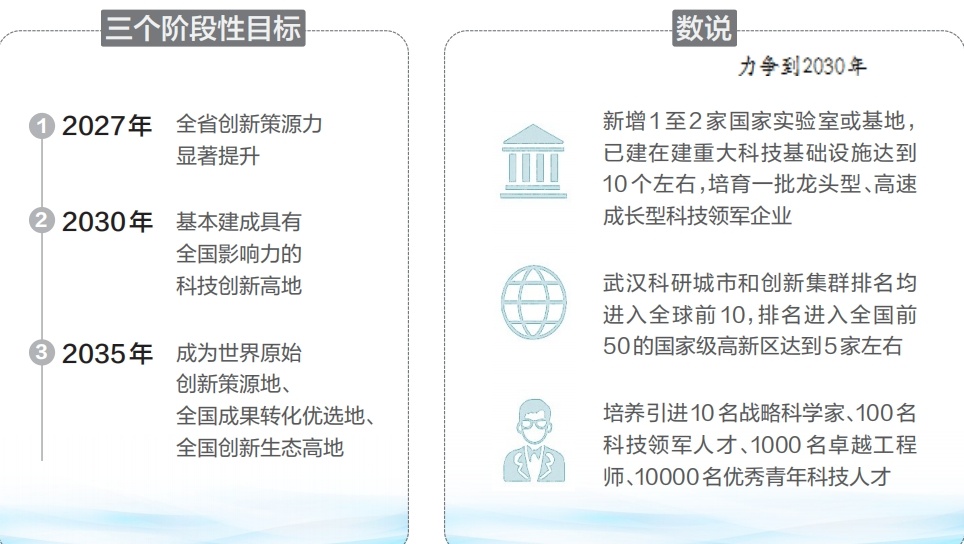 围绕3个阶段性目标,冯艳飞说,湖北将强化创新策源体系化支撑,分别从力量建设、空间布局、科技攻关、成果转化、人才集聚、创新生态等6个方面,部署22项重点任务。