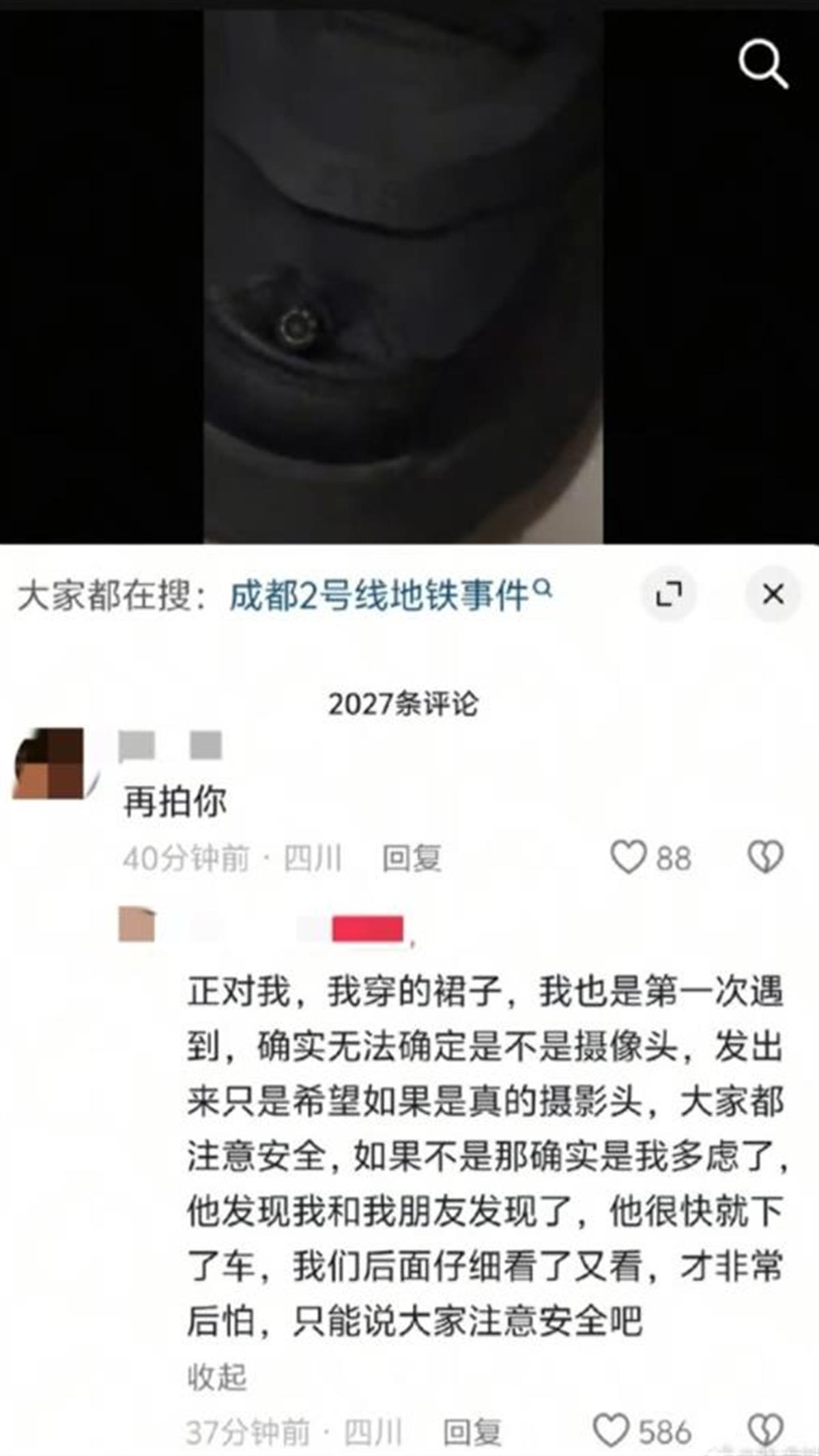 据此前新黄河客户端报道,4月25日,一名成都地铁女乘客发布视频称,其在乘坐2号线时疑似遭到一名陌生男乘客偷拍,男乘客鞋尖部位有疑似微型摄像头物件,此事引发众多网友关注。4月28日,成都地铁回应称,25日已组织百余名工作人员巡查,未发现上述偷拍情况。
