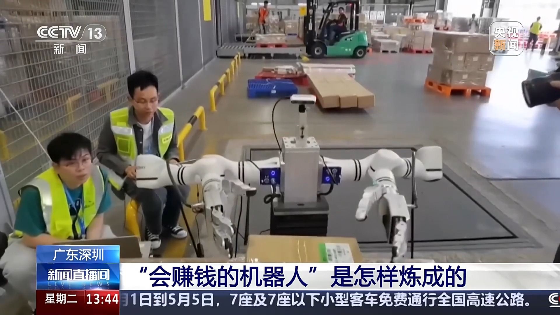 在深圳宝安机场的国际货站,一家机器人企业正在调试他们的机器手,测试这款机器手产品是否可以在机场货物分拣场景中使用。