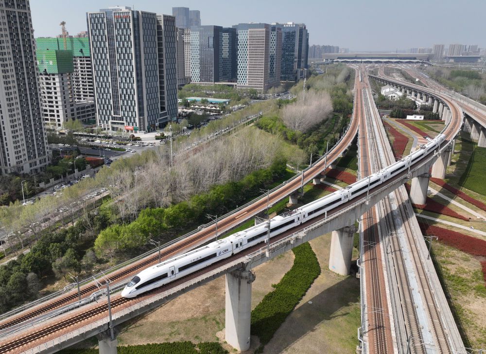 2025年3月31日,一列动车组列车驶出郑州东站(无人机照片)。新华社记者 李嘉南 摄