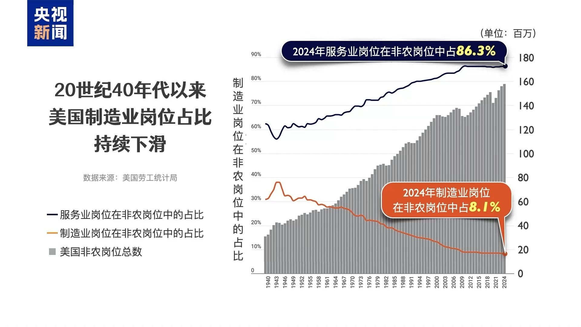 对此,彭博社一针见血地指出,“这是美国制造业残酷现实的缩影”,尽管美国政府一再宣称要“复兴美国制造”,但实际就业增长幅度不大,企业外流、基础设施不足等问题久拖未决,白宫鼓吹的“关税魔力”恐难逆转美国数十年来的产业外迁趋势。
