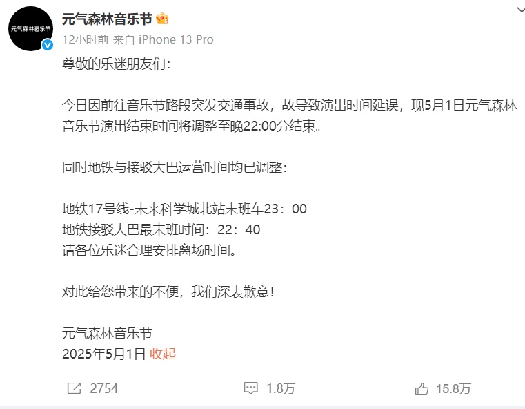 5月1日晚,@元气森林音乐节 发布致歉声明,称“今日因前往音乐节路段突发交通事故,故导致演出时间延误,现5月1日元气森林音乐节演出结束时间将调整至晚22:00分结束。同时地铁与接驳大巴运营时间均已调整。”