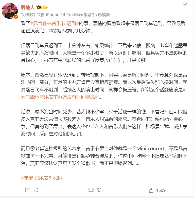 对此,微博大V乐评人@爱地人称,此时事情的原点看起来是落日飞车迟到,导致最后崔健没演完,赵露思只剩了几分钟。但落日飞车只迟到了二十分钟左右,如果统计一下后来老狼、柳爽、崔健和赵露思等缺失的表演时间,大概是一个多小时了,所以迟到有影响,但其实并不是影响的最核心,主办方在中间转场的拖沓(反复放广告),才是关键。