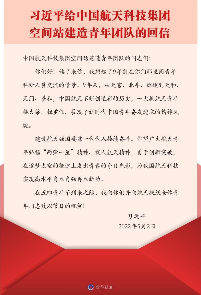 习近平总书记给中国航天科技集团空间站建造青年团队的回信。新华社发
