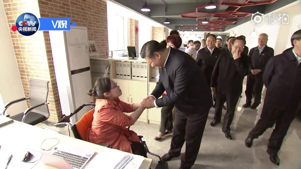 在社区社会组织孵化器办公室,总书记走到坐在轮椅上的残疾女孩杜诚诚面前,听她介绍开展为盲人讲解电影服务情况,夸奖这是一项很有意义的工作。